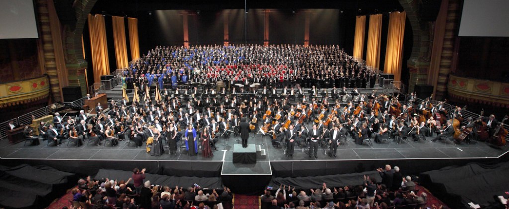 Perhaps the cake is taken by Gustav Mahler’s Symphony of a Thousand — his Symphony No. 8, which in an ideal performance has an orchestra of about 200 and a chorus of 800. It is gargantuan, and the opening Veni Creator Spiritus is as close to manic insanity as music can probably sustain.