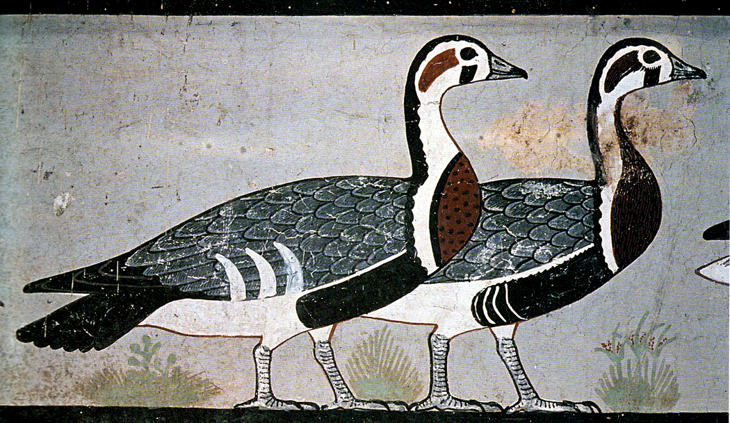 You can see it in the Egyptian tomb paintings, too. Human figures are stiff, in the artificial “King Tut” poses so familiar from the hieroglyphs. The humans are stylized and symbolic rather than naturalistic. But the animals don’t share that fate: They are seen with a grace and directness at odds with all the machinery of symbolic hieroglyphs — a real duck, a real hippopotamus, a real ibis.