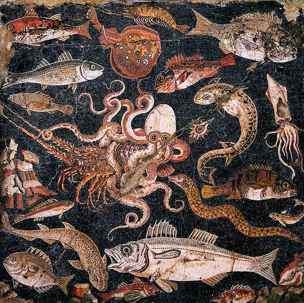 Or in the mosaics at Pompeii, with its seafood menu of crustaceans, eels, octopuses and seabass. Animals have a special place in art.