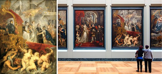 And it is what I think of when I reopen my worn copy of Janson and look at the reproduction of the Disembarkation of Marie De Medici at Marseilles by Peter Paul Rubens, tiny on the page, and think of the room in which it sits at the Louvre. The painting is more than 12 feet tall and surrounded by 23 other giant paintings in a room dedicated to the series. The effect is quite overwhelming. On the page, it is a confused clump of busy mythology; on the wall, it will blow you away.