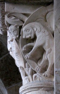 Looking at the many column heads in the nave of the abbey church at Vezelay, you can see the narrative drive of the Romanesque artists. Many tell Old Testament stories, such as David and Goliath, or the slaying of Absalom by Joab, or even the rather comical Noah and his wife.