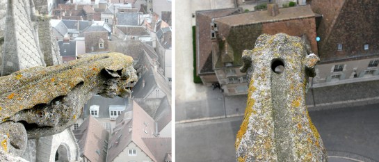 And up this high, you can see the gargoyles from above, and see the grooves down their backs and the holes through the skulls that guide the rainwater out into the streets, away from the foundations of the church. Gargoyles are drainspouts; the others are chimera — the odd animals that decorate corners, niches and summits. In the Middle Ages, they were all called “babewyn,” which was Italian for “baboon.”