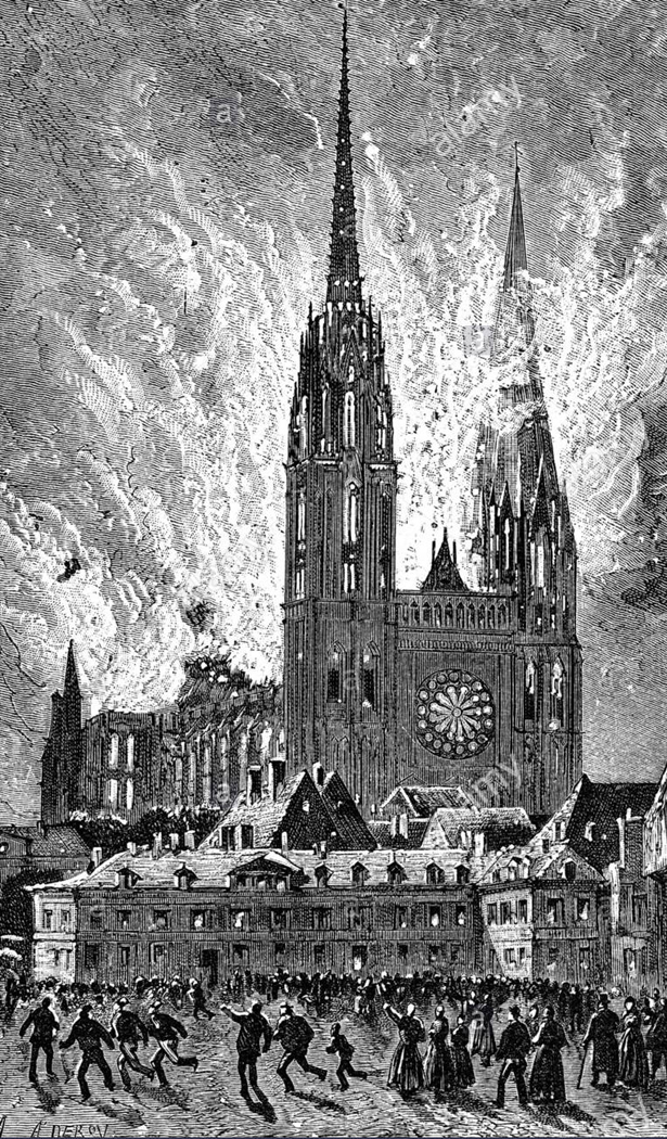 The original Gothic spire had burned down in 1514 and was finally replaced by a wooden spire covered in gold-plated lead in 1580, paid for, in part, by the selling of indulgences. In 1562, it was damaged by rebelling Calvinists during the Wars of Religion, when much of the statuary and windows were destroyed. The cathedral was struck again by lightning in 1625 and 1642, damaged by a hurricane in 1683. The choir burnt in 1727 and a bell broke in 1786.