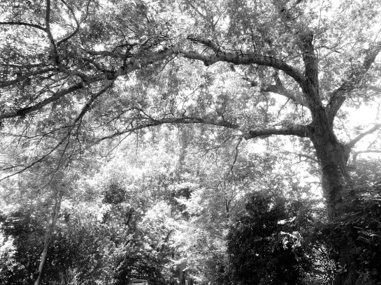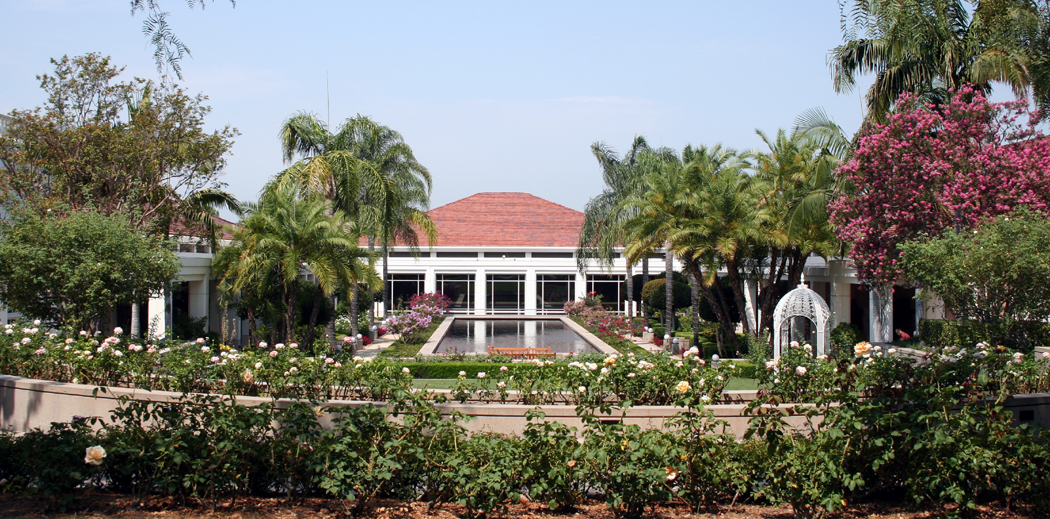 The house, shaded under a grove, is rather dwarfed by the huge, impersonal marble and glass library, with its parking lot and fountains.