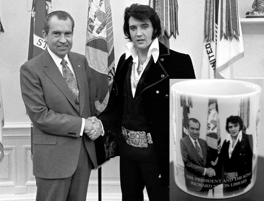 ”This is our bestseller,” he told me, and dragged me with a smile over to the shelf with the coffee mug on which is printed a photograph of Nixon and Elvis.