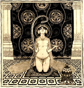 “A horror of cold, or perhaps a feeling of shame, at first made her hesitate. But she recalled Schahabarim’s orders and advanced; the python turned downwards, and resting the centre of its body upon the nape of her neck, allowed its head and tail to hang like a broken necklace with both ends trailing to the ground. Salammbo rolled it around her sides, under her arms and between her knees; then taking it by the jaw she brought the little triangular mouth to the edge of her teeth, and half shutting her eyes, threw herself back beneath the rays of the moon. The white light seemed to envelop her in a silver mist, the prints of her humid steps shone upon the flag-stones, stars quivered in the depth of the water; it tightened upon her its black rings that were spotted with scales of gold.
