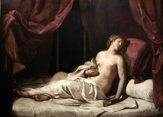 The two rebellious lovers, having been conquered by the young Octavian were at odds over what to do. Cleopatra had a false message sent to Antony that she is dead. Antony ran himself into his sword, but botched his suicide and was brought to Cleopatra, where he then expired. Cleopatra mourned and locked herself in her mausoleum. And then, according to Plutarch: