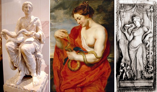 Not that they are the only two: There are paintings and sculptures of the Roman goddess Hygea, goddess of health, which show her feeding a snake — the snake being the sacred animal of Asclepius, the god of medicine.