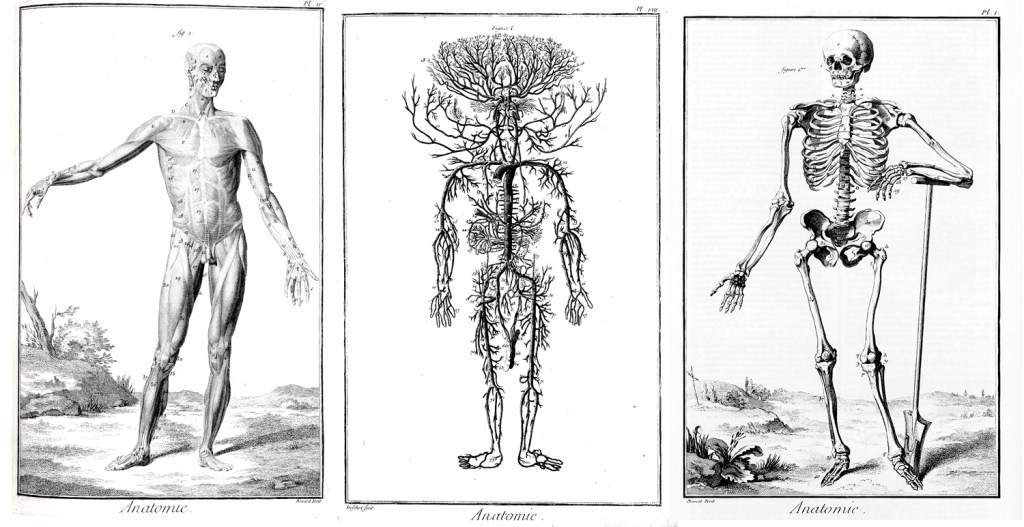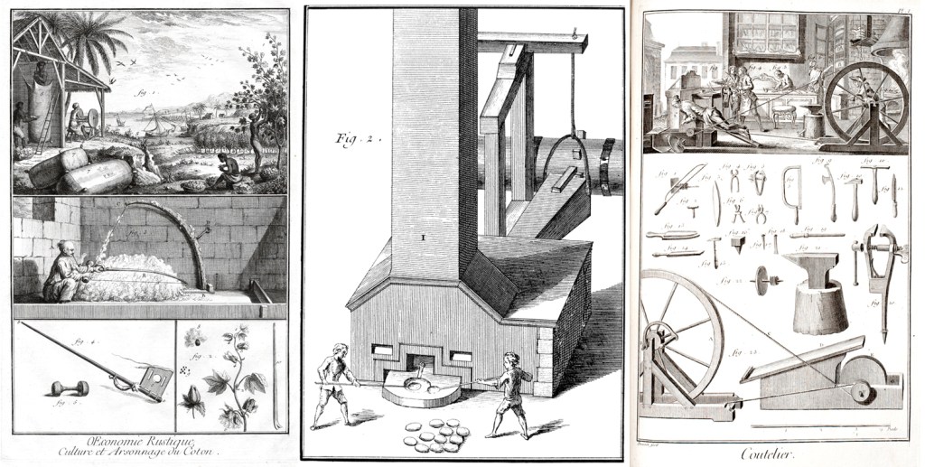 But Diderot is remembered primarily for his work on the Encyclopédie, which he edited along with Jean le Ronde d’Alembert, and for which he wrote some 7,000 entries. It was published serially and periodically revised from 1751 to 1772 and mostly published outside of France and imported back in — censorship was strict and many books were published in the Netherlands or Switzerland to avoid French government oversight.