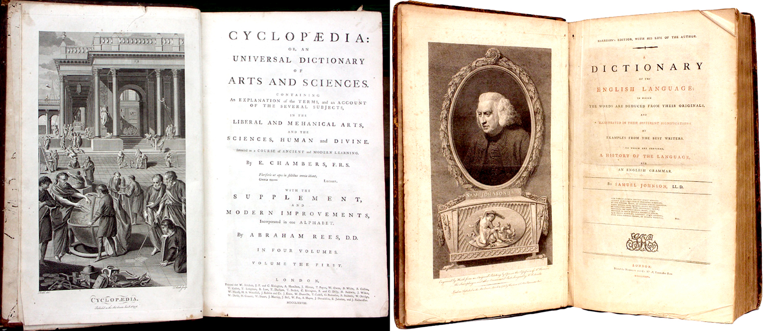 There had been earlier attempts at encyclopedias, including Ephraim Chamber’s Cyclopedia, or an Universal Dictionary of Arts and Sciences published in London in 1728, and John Harris’ 1704 Lexicon Technicum: Or, A Universal English Dictionary of Arts and Sciences: Explaining Not Only the Terms of Art, But the Arts Themselves. The 18th century wallowed in long book titles.