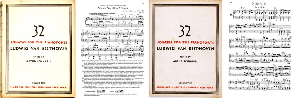 There are the two volumes of Beethoven’s piano sonatas, edited by Artur Schnabel. I could never be without them. I read scores for pleasure just as I read words. I still have piles of Kalmus and Eulenburg miniature scores that I have used over the years to study music more minutely than ears alone can permit.