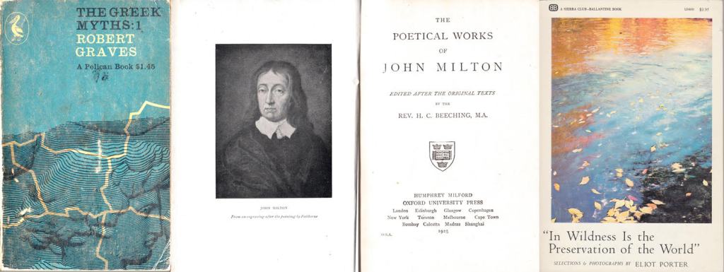 I still have the Robert Graves two-volume Greek Myths that I had when taking a Classics course my freshman year, and the Oxford Standard Authors edition of Milton that I took with my in my backpack when I tried to hike all of the Appalachian Trail (“tried” is the operative word), and the photographic paperback version of the Sierra Club book, In Wildness Is the Preservation of the World.