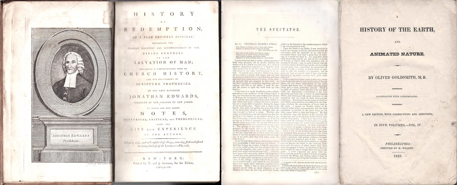 When I was just out of college, a neighbor of my parents died and left my a pile of old books, printed in the 18th and early 19th century. There are three volumes of the poetry of William Cowper, a History of Redemption by Jonathan Edwards, a fat volume with tiny print collecting the Addison and Steele Spectators, and a single volume of Oliver Goldsmith’s History of the Earth and Animated Nature. I have Volume IV of five volumes, which contains descriptions and illustrations of birds, fishes and “Frogs, Lizards, and Serpents.”