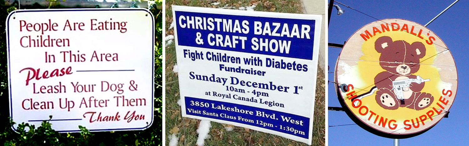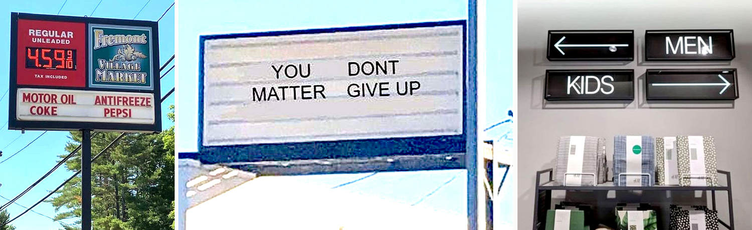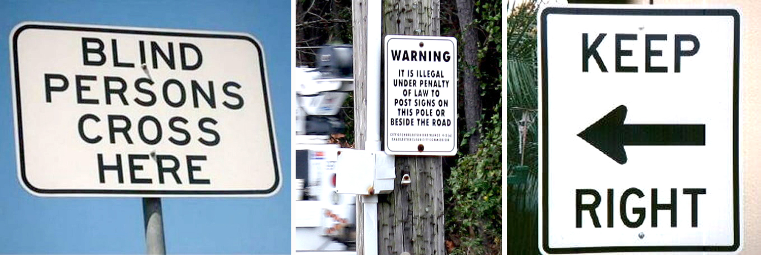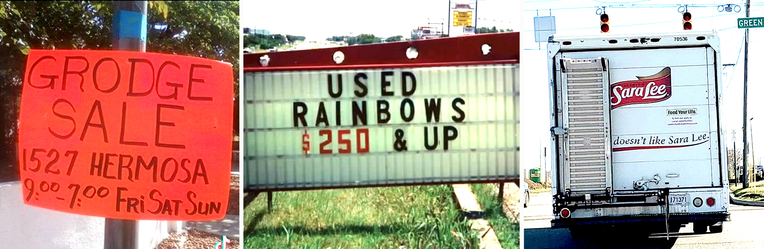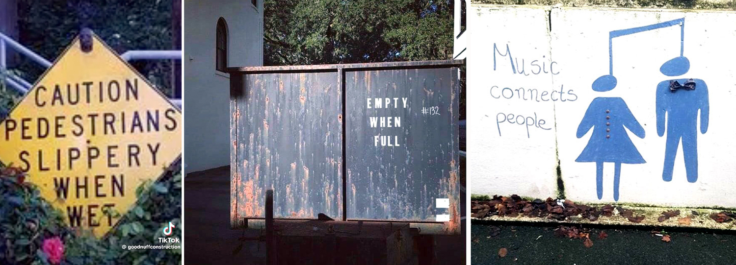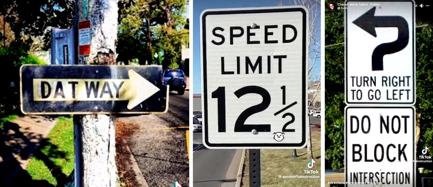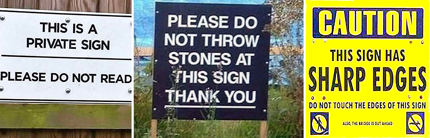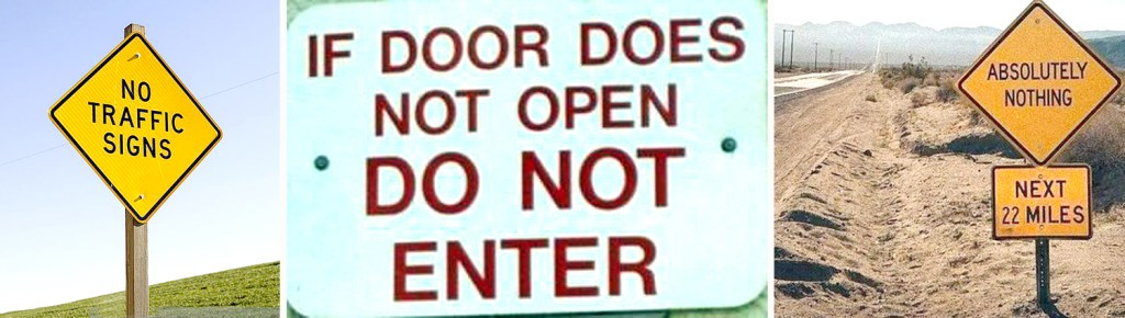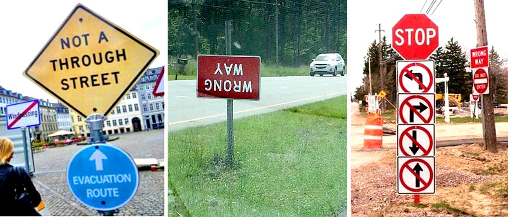 At any rate, there are many fellow travelers who collect these little roadside giblets. They show up on FaceBook and Twitter (I know, “X”), or in videos on YouTube. There is no shortage of misspellings, unnoticed juxtapositions, contradictory instructions, and bad word spacings.