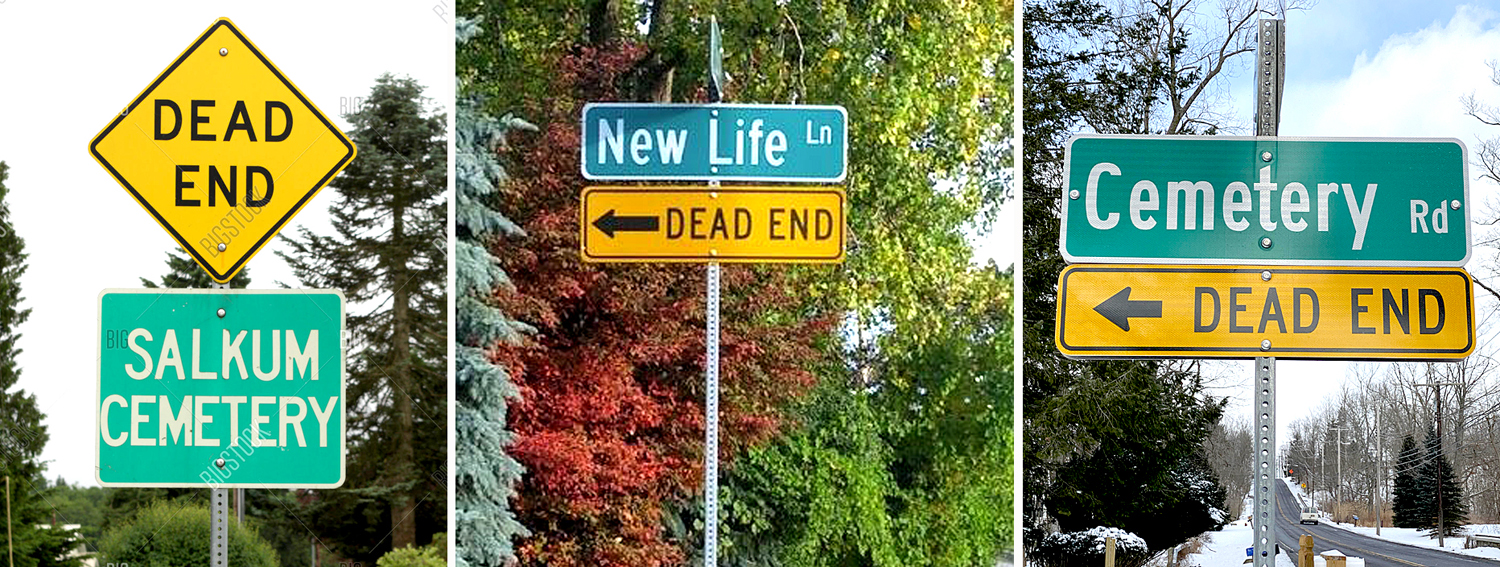 Then there is just plain irony, as in all those roads to cemeteries that feature “Dead End” signs.