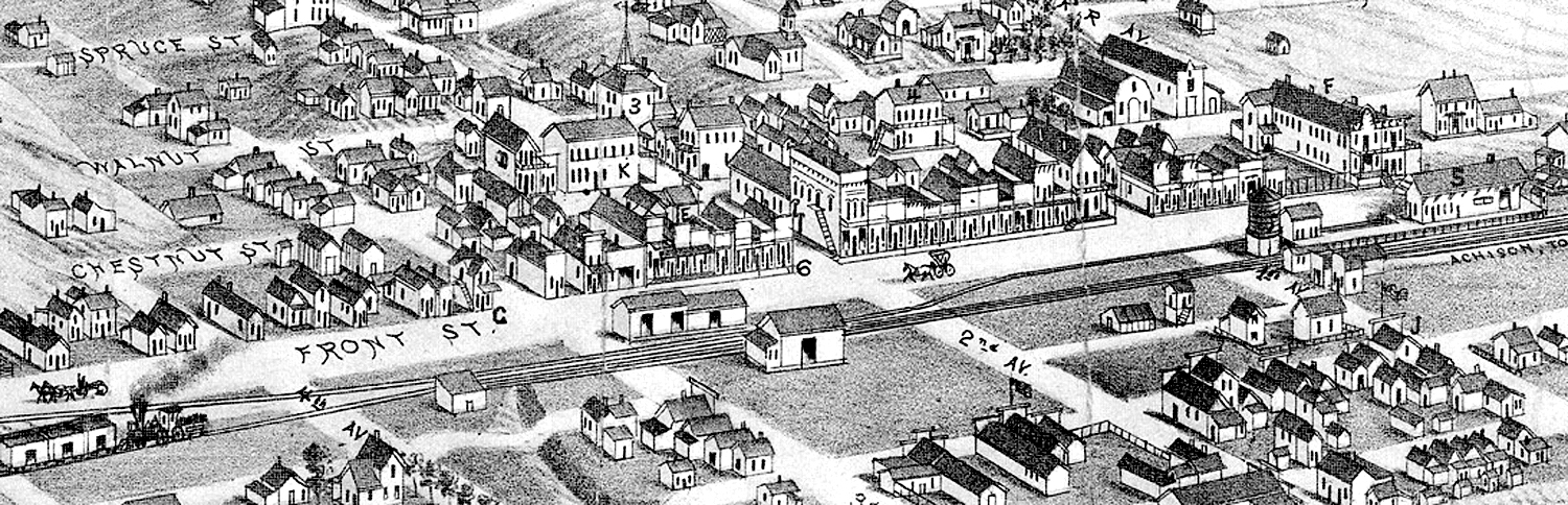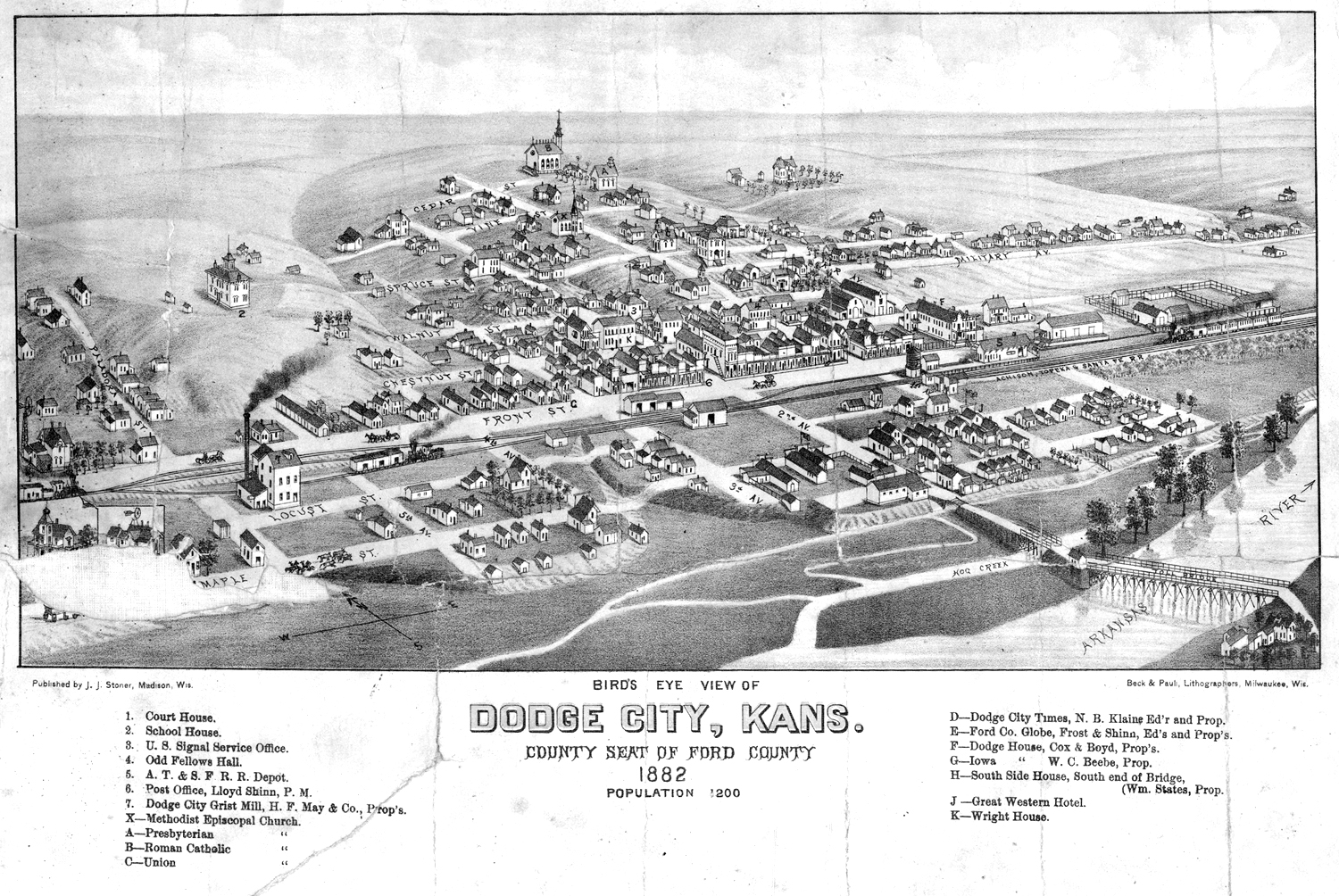 The reality of Dodge City was that it was built alongside the Arkansas River, where the Santa Fe Trail paralleled the river. When the railroad came, it, too, followed the river. The town then grew on the far side of the tracks, leaving the town plan with the river to the south, the tracks to the north, and Front Street and the primary businesses in a single row on the north side of the street, as shown in this detail of the bird’s-eye view map, from 1882.