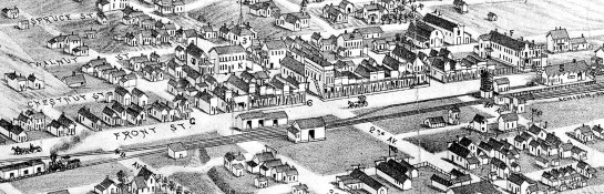 This was a common city plan, and can be found all across both the West and the South, wherever a town grew alongside railway tracks. Tracks; road; storefronts, in that order.
