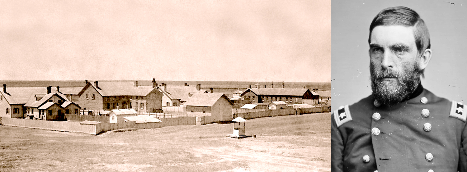 And so, on April 10, 1865, a company of soldiers from the Eleventh Cavalry Regiment under orders from General Grenville M. Dodge established a camp on the Arkansas River along the Santa Fe Trail. Lacking building materials, they made dug-outs into the river banks for shelter. Dodge later wrote in his autobiography that the soldiers sarcastically named the place after him because they “were so mad at being sent there .. with so little accommodations that they named the place Camp Dodge.”