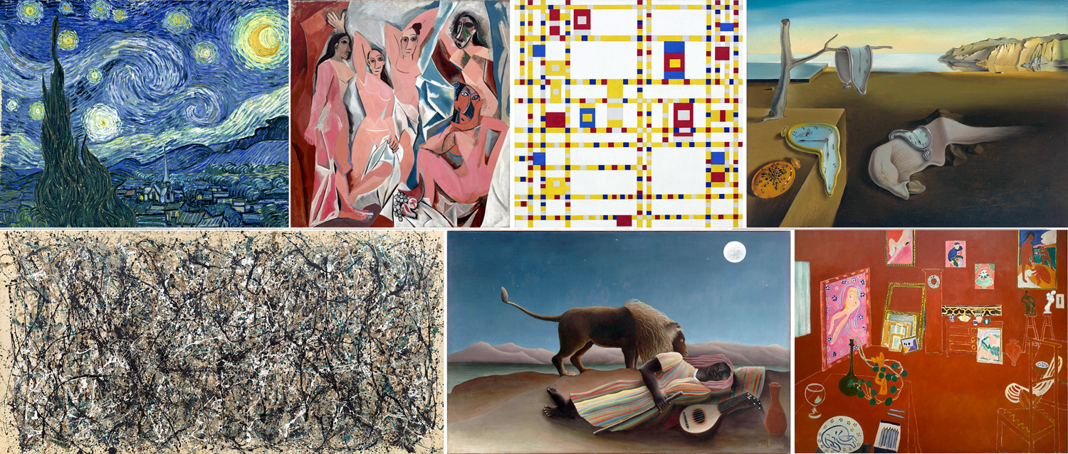 And most of all — the Museum of Modern Art, where I felt most at home. I came to know many famous paintings as old friends. Van Gogh’s Starry Night; Matisse’s L’Atelier Rouge; Picasso’s Demoiselles d’Avignon; Pollock’s One Number 31; Mondrian’s Broadway Boogie-Woogie; Henri Rousseau’s Sleeping Gypsy; Dali’s Persistence of Memory — all proper blue-chip Modern Art landmarks.