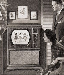 In my earliest years, we had no TV, but I cannot remember much before the great wooden chunk of furniture with the little oval screen of greenish gray — the DuMont television we had in suburban New Jersey.