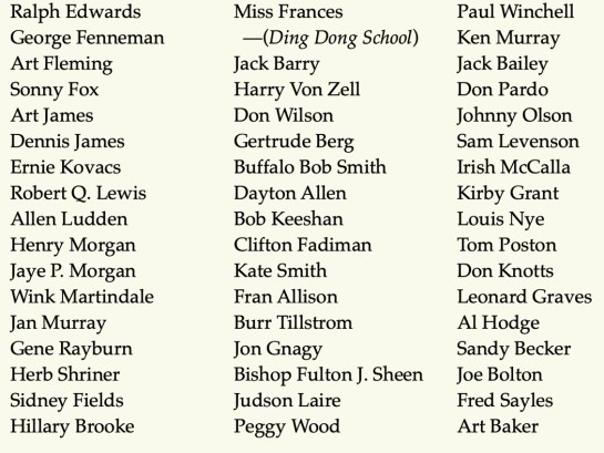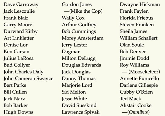 Joe Franklin and Memory Lane; Jack Bailey and Queen for a Day; Jon Gnagy and Learn to Draw. Jack LaLanne and Marty Glickman and Win Elliot and Jack Paar.