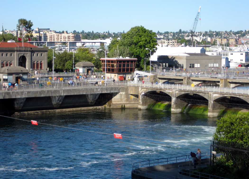 The locks are the main tourist attraction, with the salmon ladder where, in the proper season, you can watch coho and chinook salmon swim upstream to spawn. And in another season, you can see steelhead trout come back downstream and head out to sea.