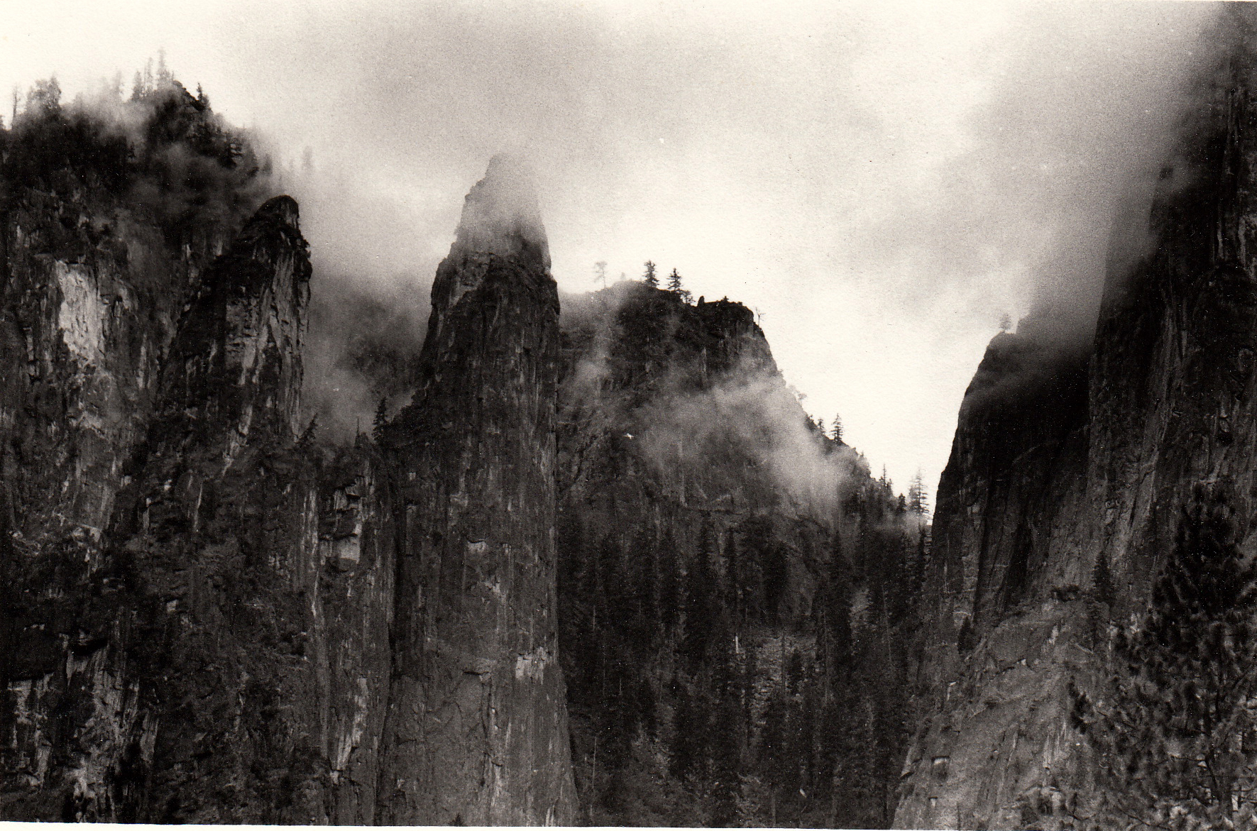 A sheer rock wall, partially obscured by mist, rose straight up to the jagged tops of the peak, like something from a Bierstadt painting.